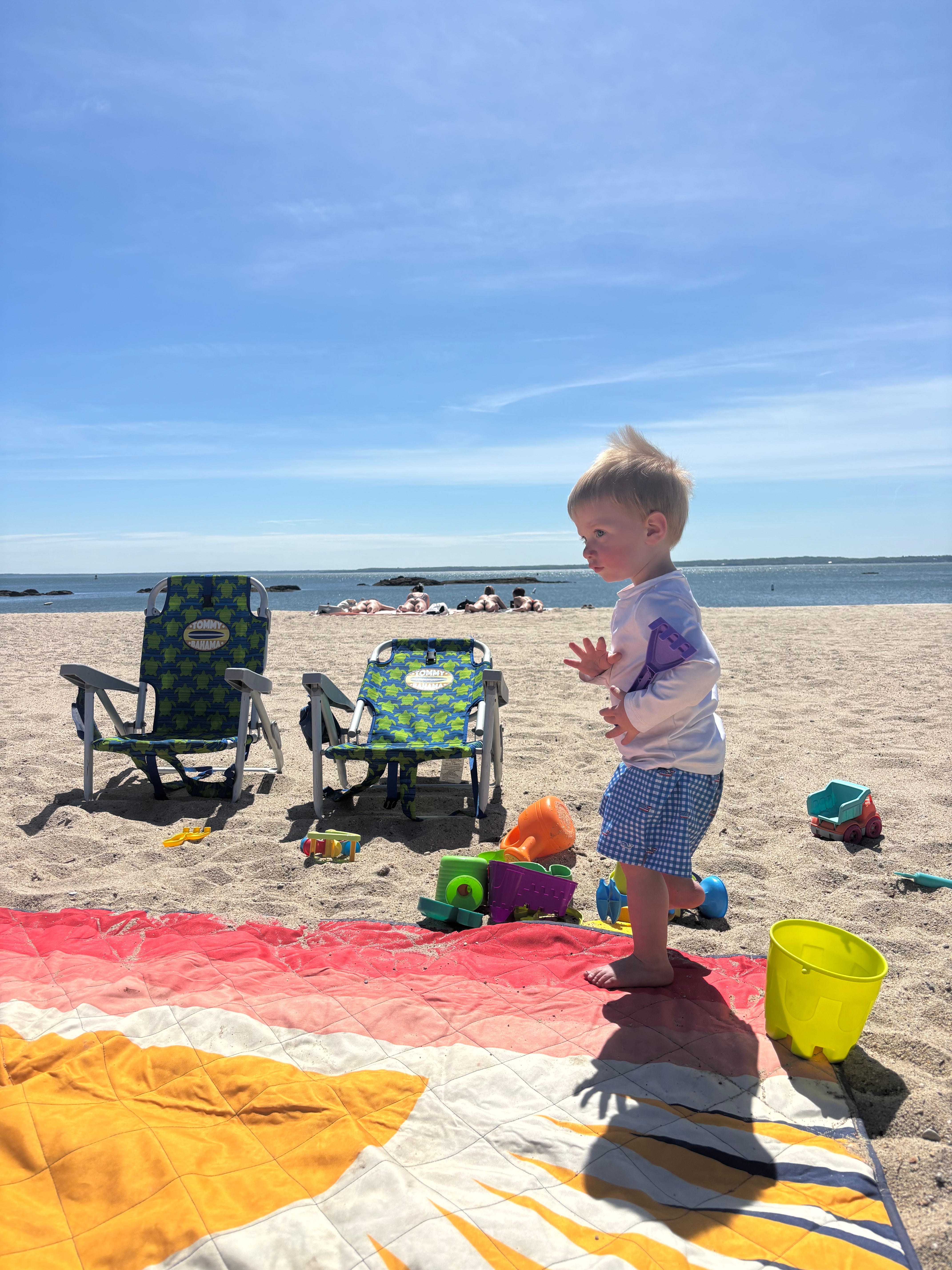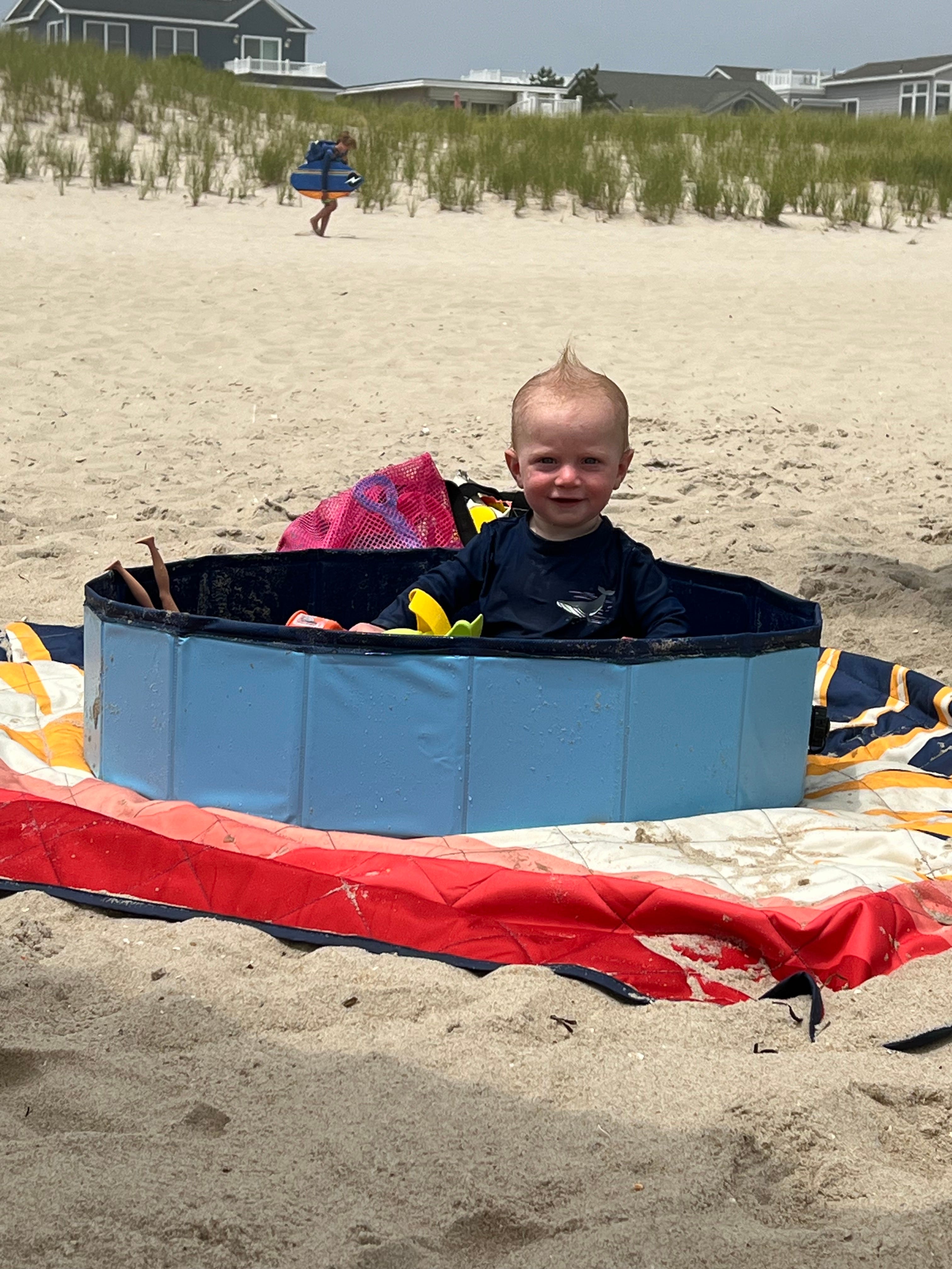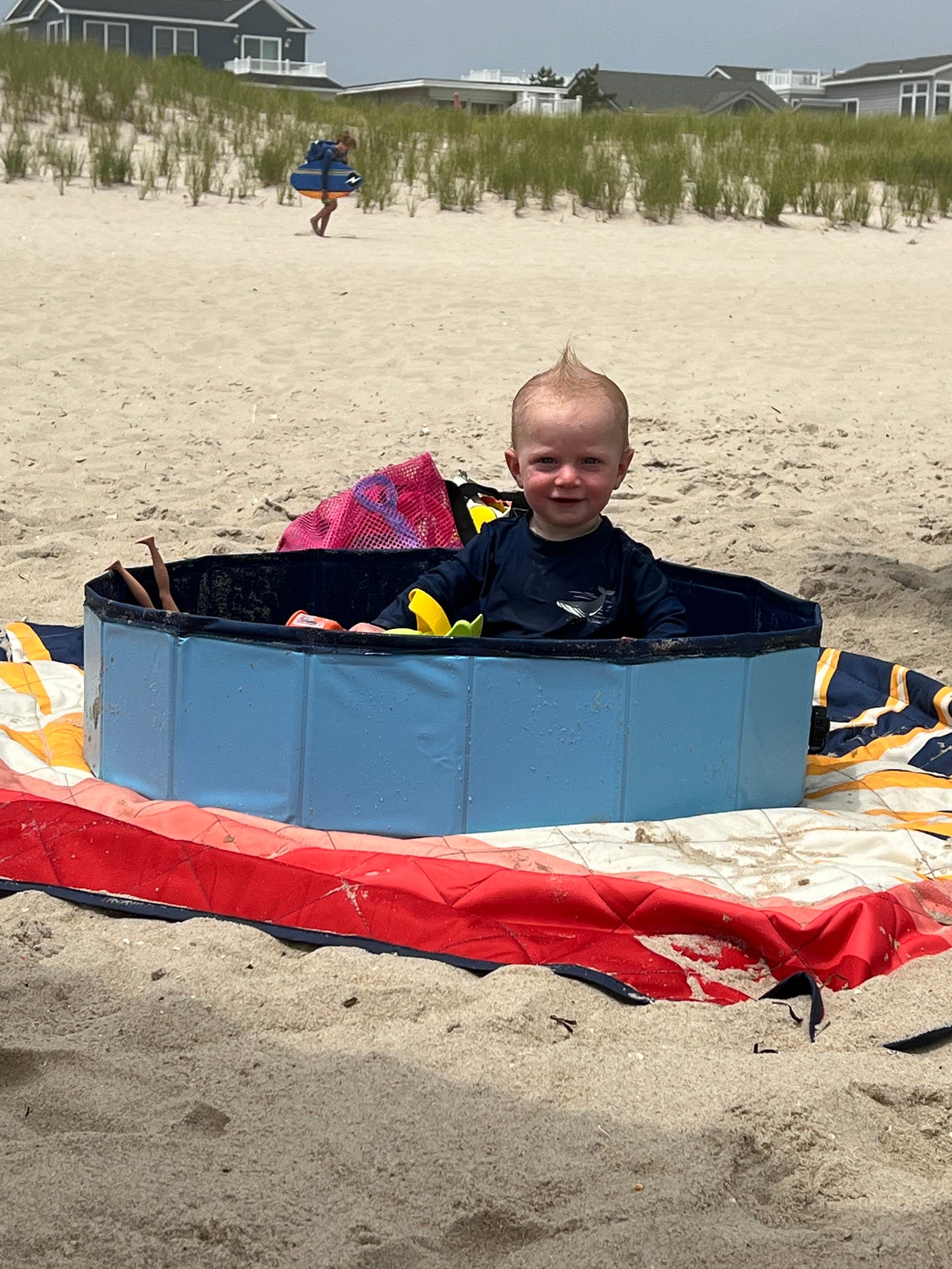 It may seem annoying to lug toys, chairs, and a baby pool down to the beach, but honestly it will make your day so much easier. My kids love playing with different sand toys, even if you only bring a few it will keep them entertained for hours. My son is 1 1/2 now and my husband bought a dog pool off Amazon last year and it was a lifesaver. We would fill it up with water when we got to the beach and he would play in it all day. Every time I bring this pool to the beach multiple people ask me where it’s from and every kid on the beach wants to play in it! My kids even spent an hour yesterday filling it up with water and thought it was so fun! Throwback picture!