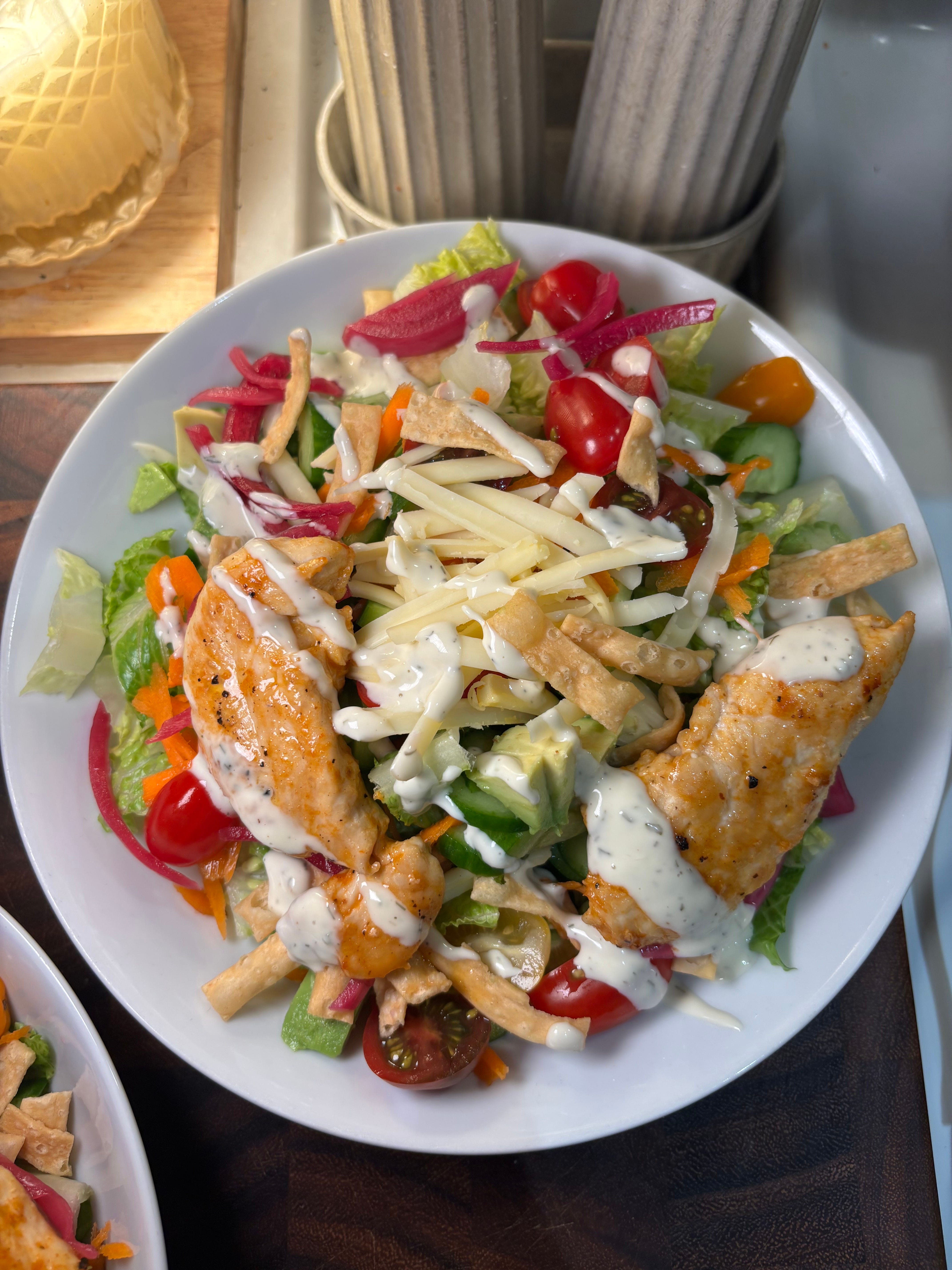 Assemble the Salad: In a large bowl or on a platter, layer the chopped romaine lettuce as your base. Add the shredded carrots, cucumbers, pickled onions, cherry tomatoes, avocado, and cheddar cheese.