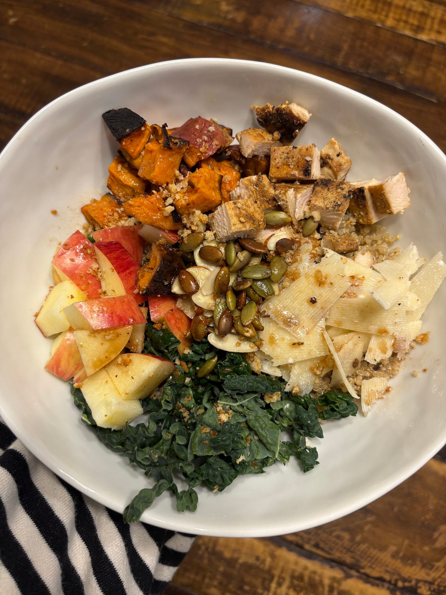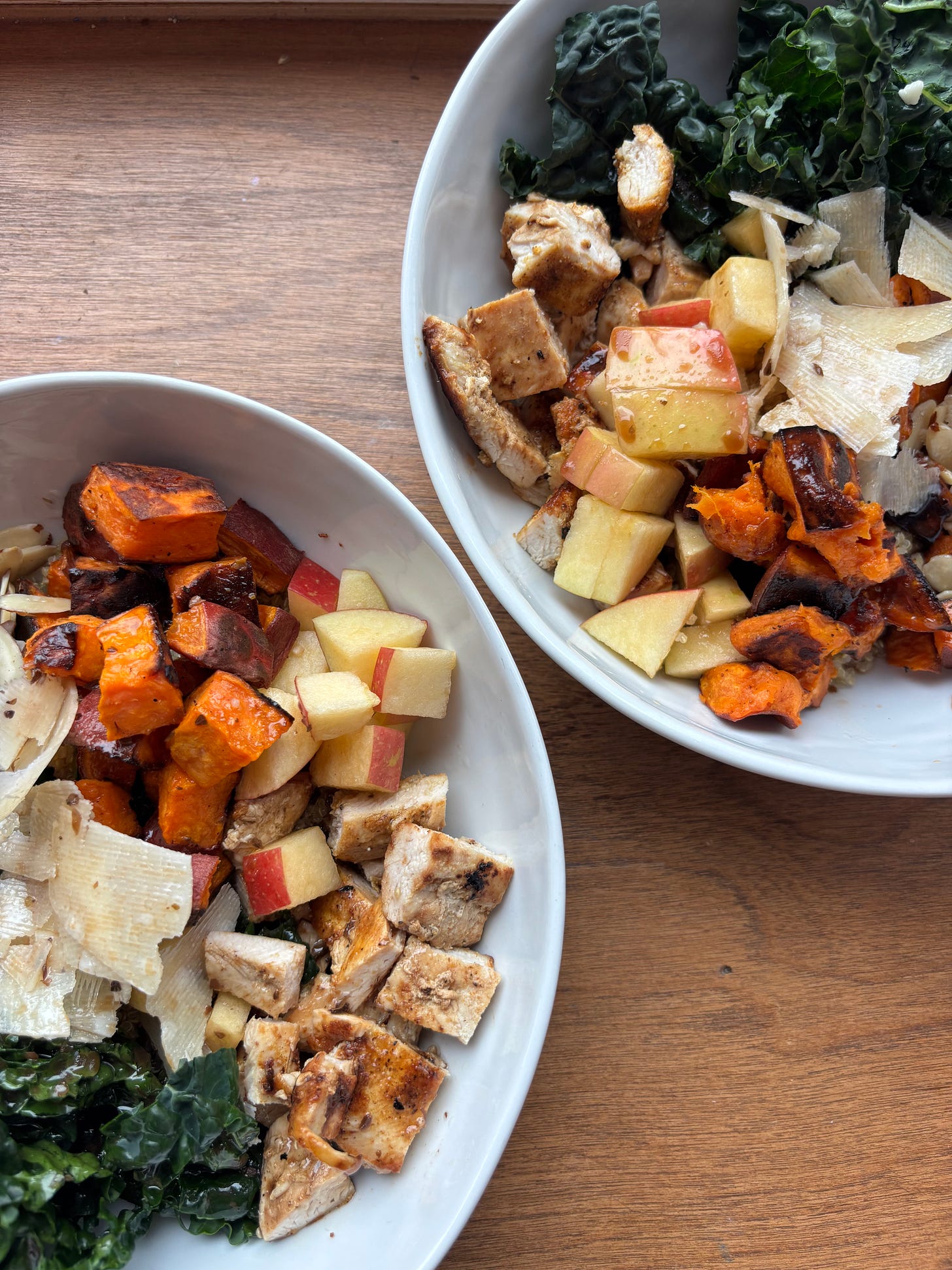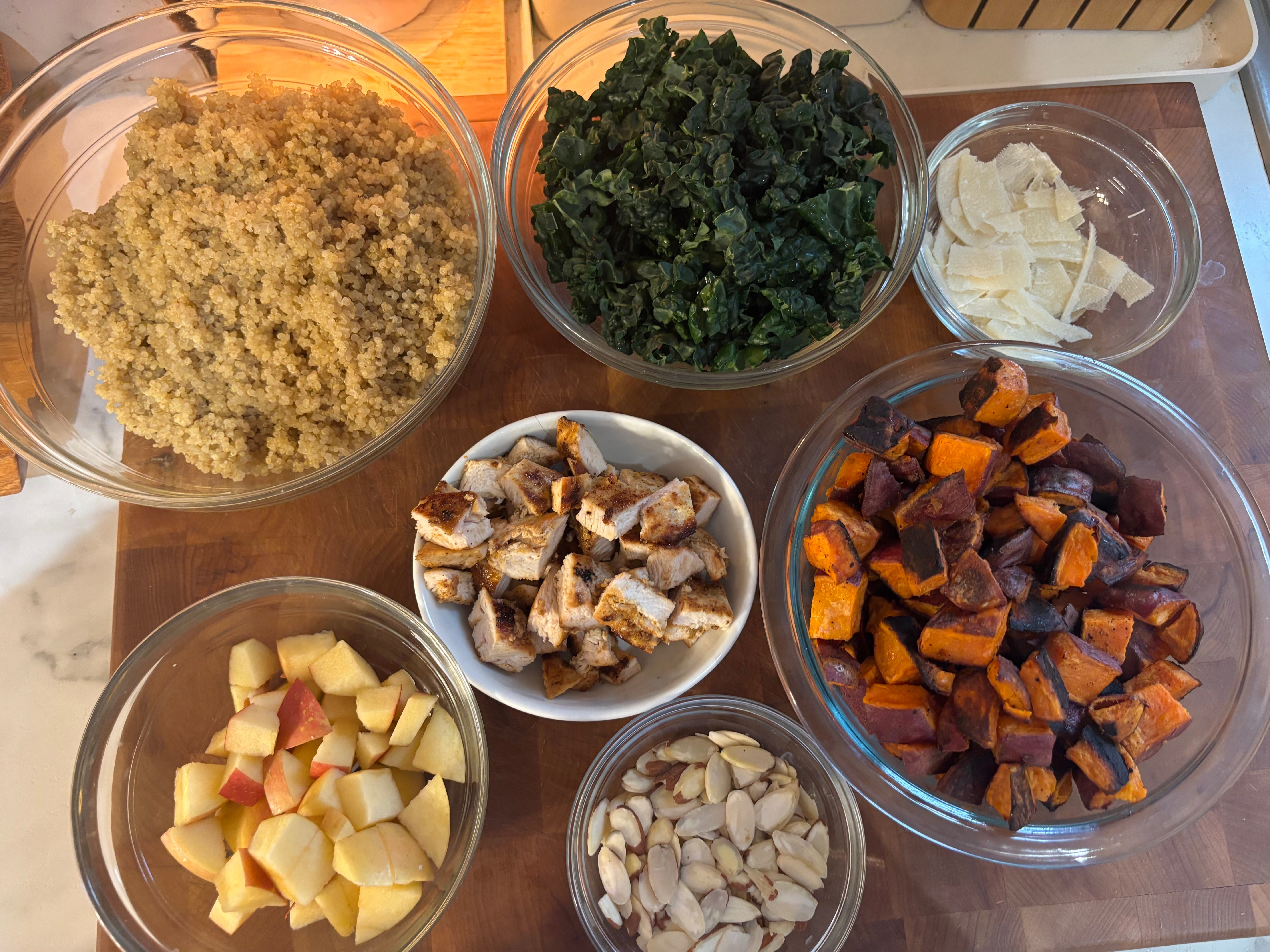 3. Assemble the bowl: In a large bowl, layer kale and arugula as your base. Add warm quinoa, roasted sweet potatoes, grilled chicken, apples, and almonds.