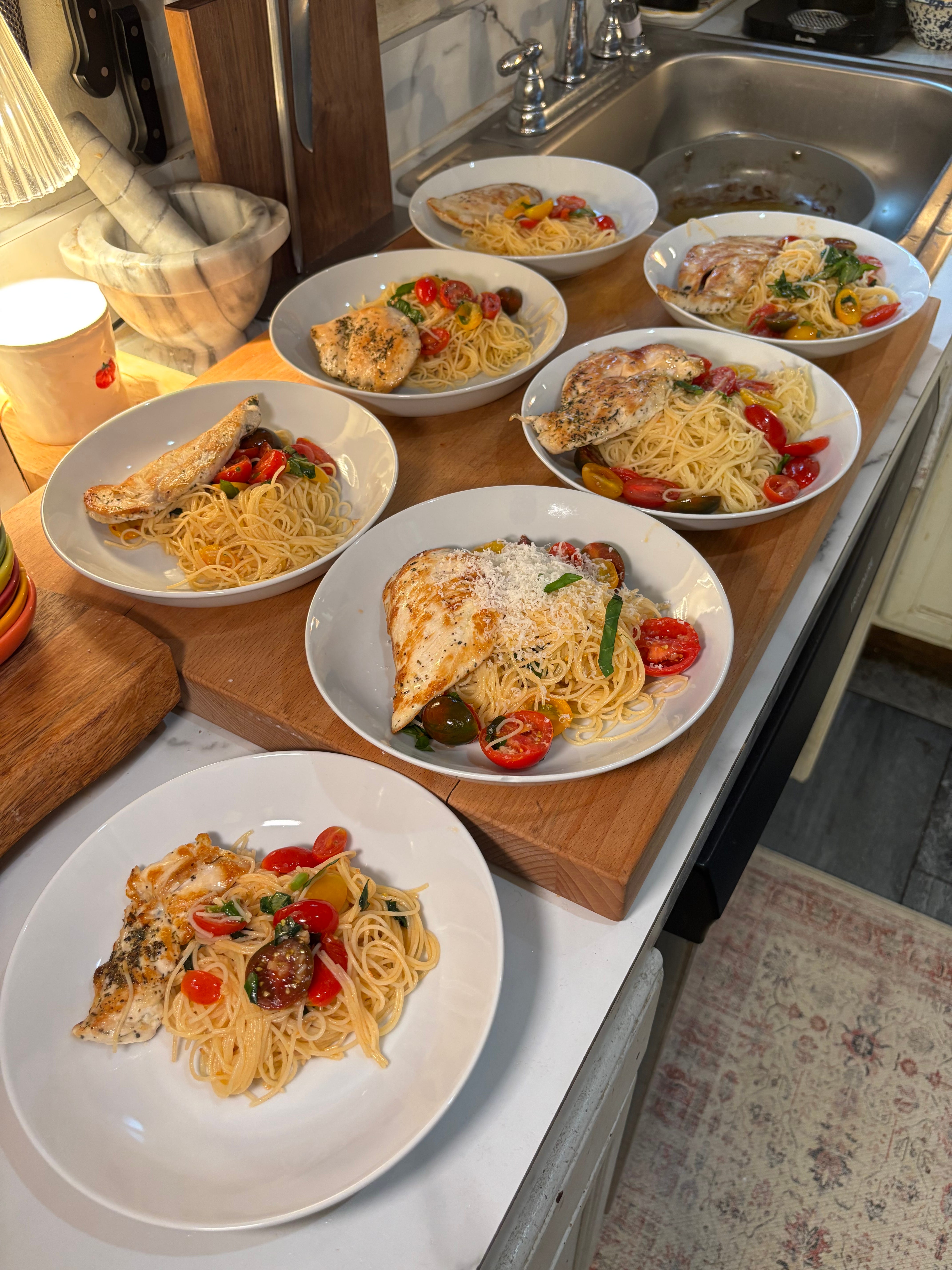 We had grilled chicken with summer garden pasta! This is such a perfect recipe for summer! Tomato season is definitely my favorite season so I am so excited to make this recipe all summer! My boys don’t love tomatoes so I made them string beans on the side. One of my daughters tried tomatoes for the first time in this recipe and loved them. I was so excited! Here is the Recipe!