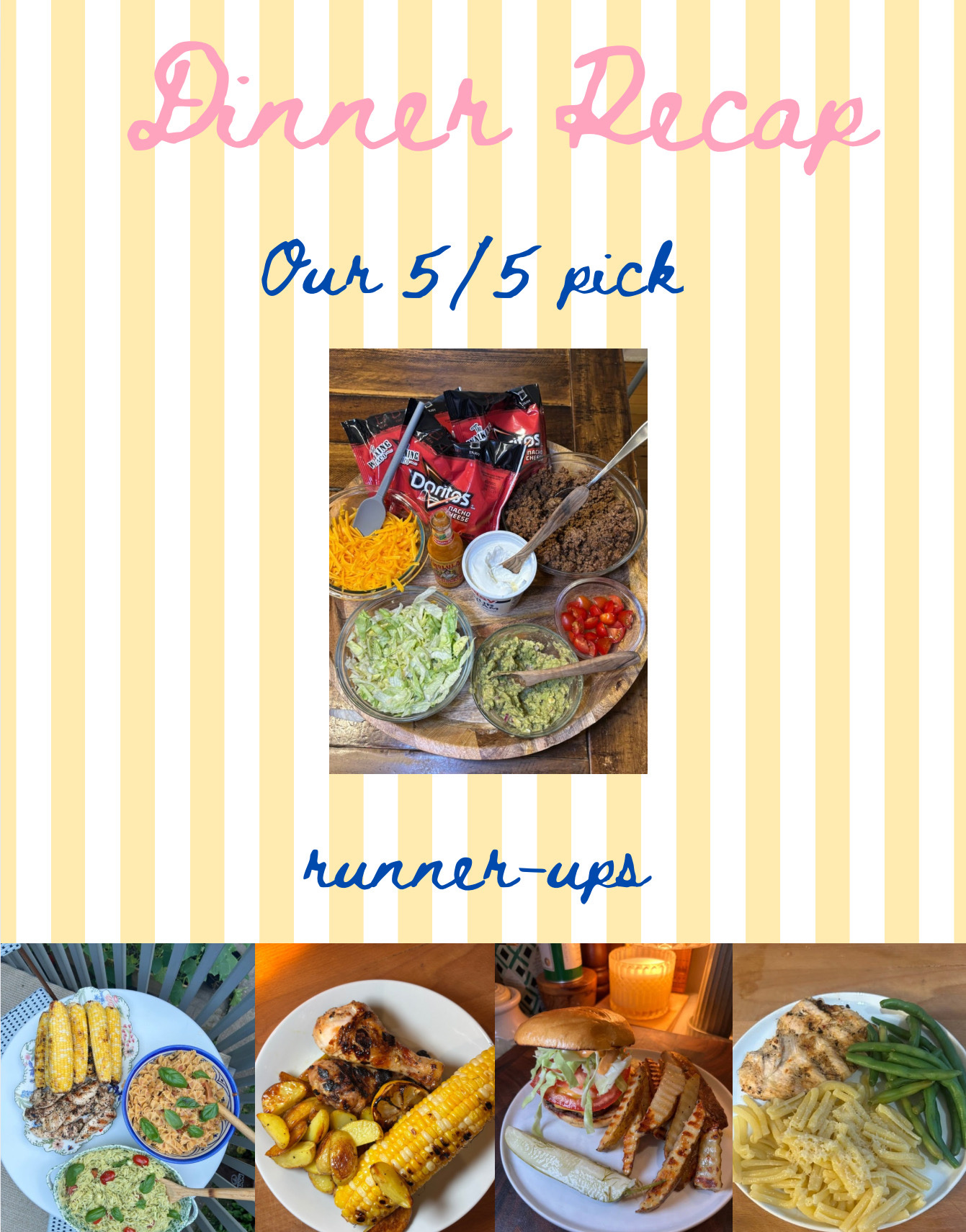 Winner of the Week: Walking Tacos – We had these at a baseball game a few weeks ago, and I knew I had to recreate them. I ordered individual Doritos bags from Amazon and thought they were so cute! This would be the perfect meal to serve at a party or on vacation, and I can’t wait to make them agai…