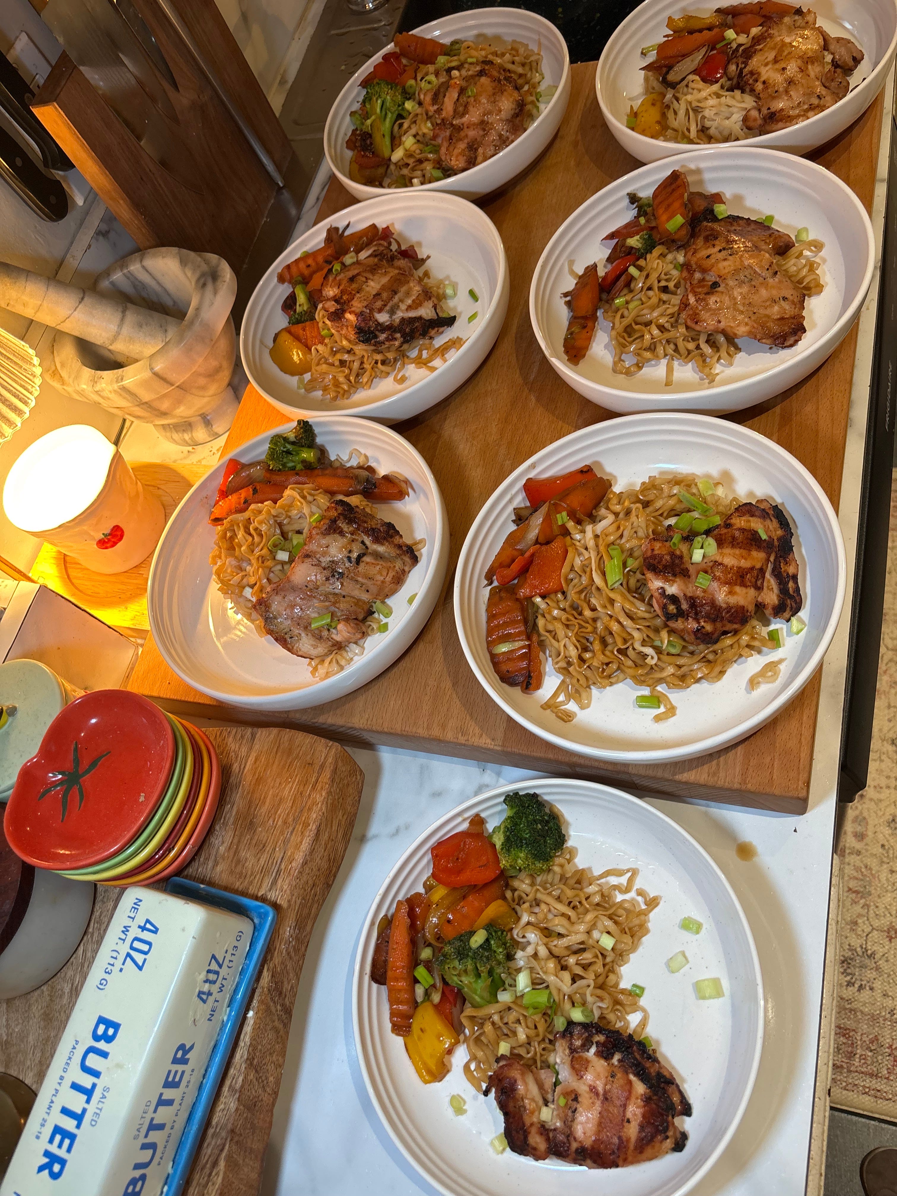 On Friday, I came home from the mall and didn’t feel like cooking an extravagant dinner. I marinated some chicken in Japanese BBQ sauce and threw it on the grill. Then I made some Momofuku noodles and a veggie stir-fry with whatever I had in the fridge. It was way better than takeout and came together super quickly!