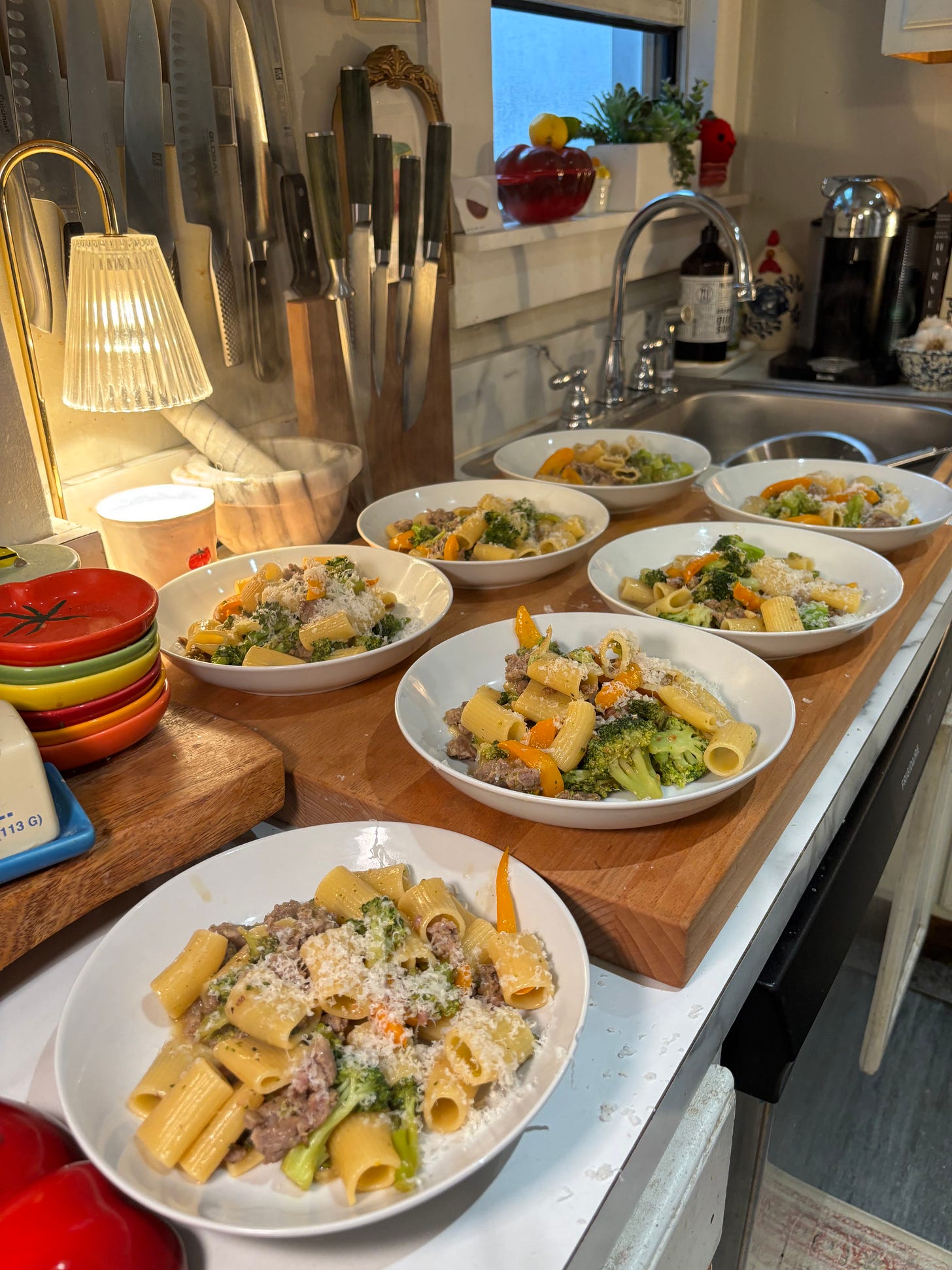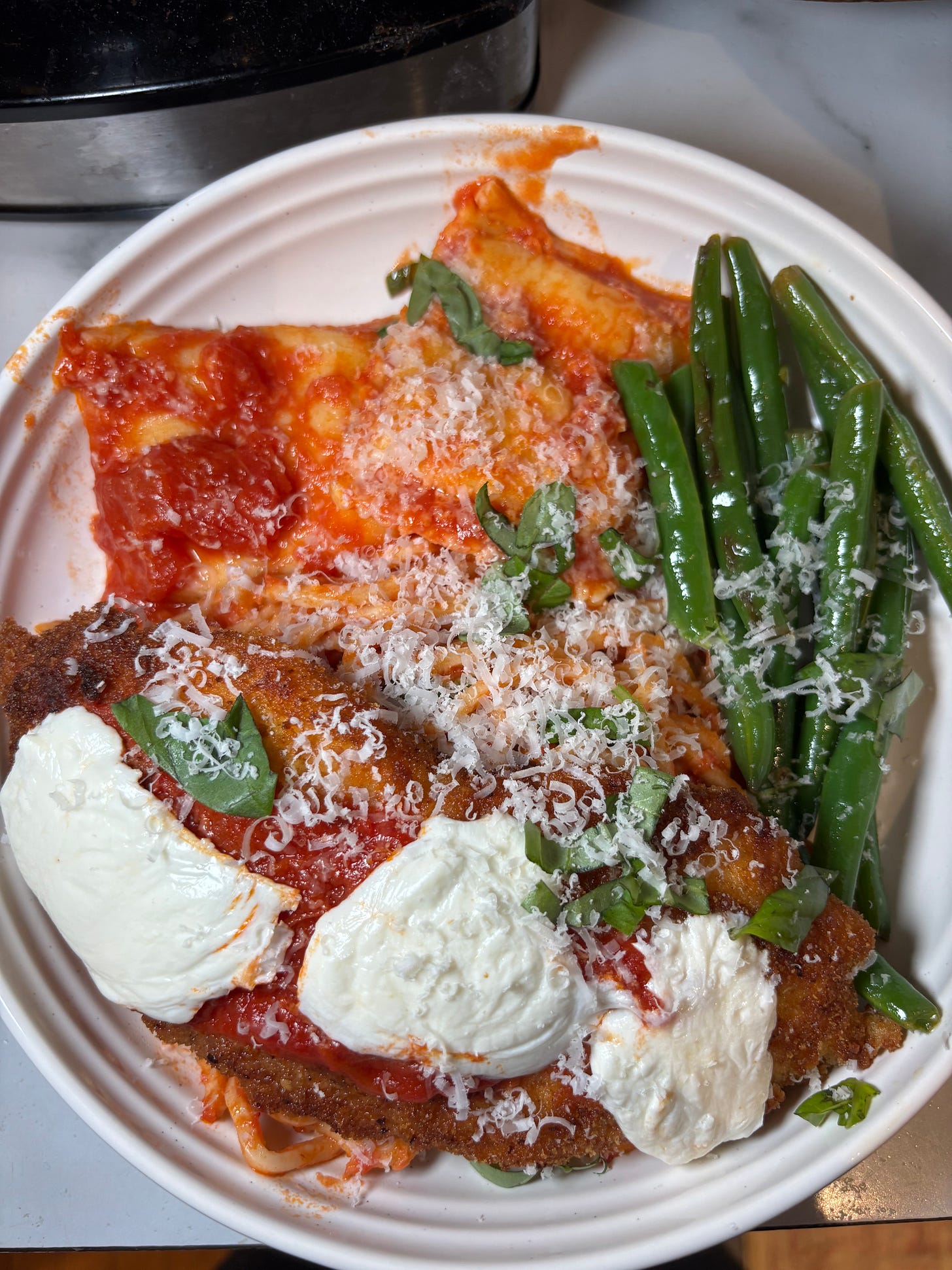 On Saturday morning, I went to a butcher on Arthur Avenue. It’s the only place I shop for chicken breasts when I plan on making chicken cutlets—they slice them so thin, and it’s the only way we’ll eat them. So on Saturday, I made Chicken Francese, and on Sunday I had my family over for dinner and made Chicken Parm. These are both such kid-friendly dishes and probably my kids’ favorites out of all the dinners I make. I also got fresh pasta and ravioli from a place called Borgatti’s, which you can’t miss if you’re ever on Arthur Avenue!