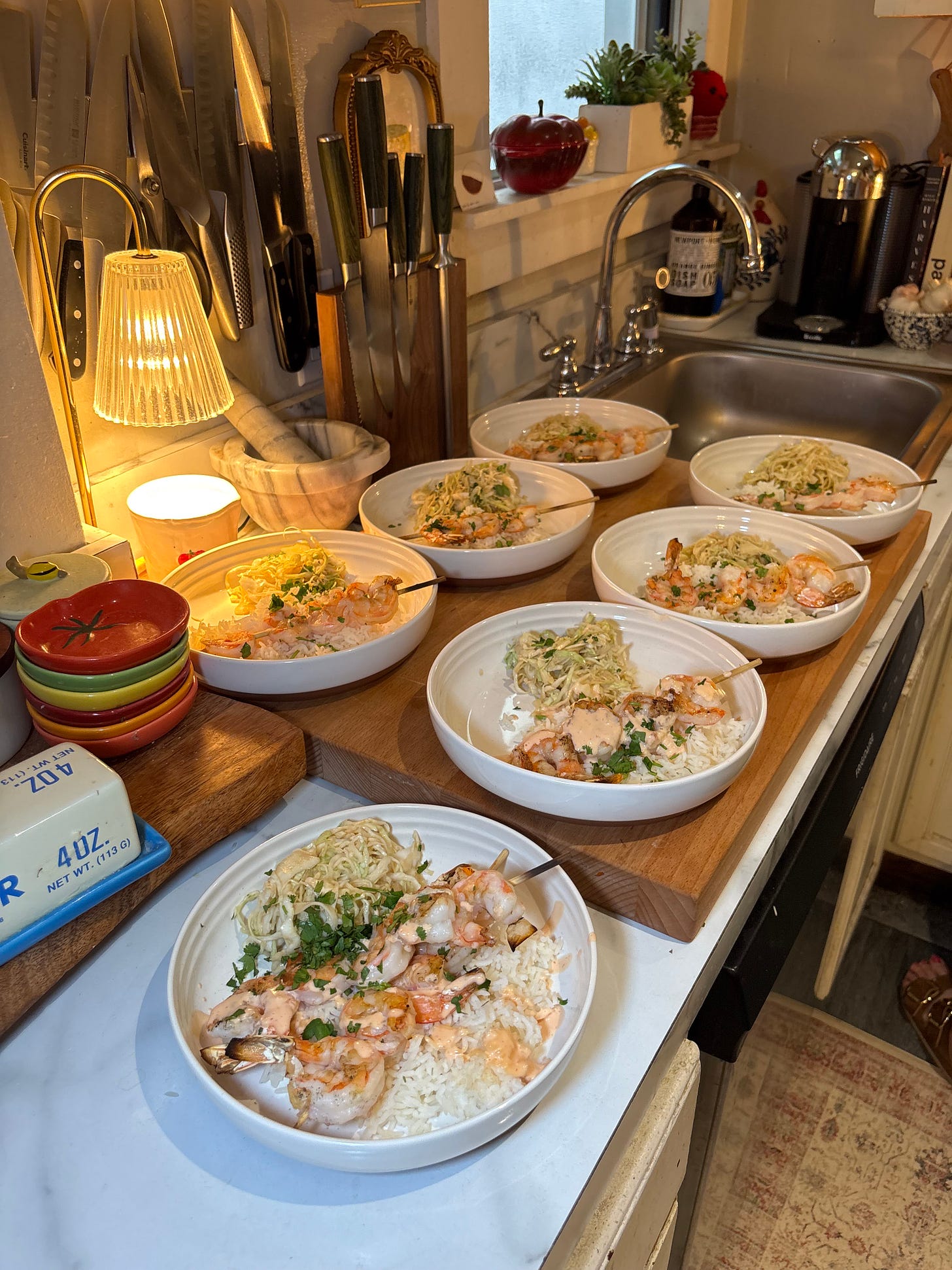 This shrimp dinner was so good! The bang bang sauce was the star of the show. I’m also convinced that kids will eat anything if you put it on a skewer—my kids thought these were so fun. Only half of them loved the coleslaw, but I don’t think I ate coleslaw until I was a teenager, so I didn’t really mind. I love shrimp dinners because they cook in just minutes! And as always, I made my rice in the rice cooker.