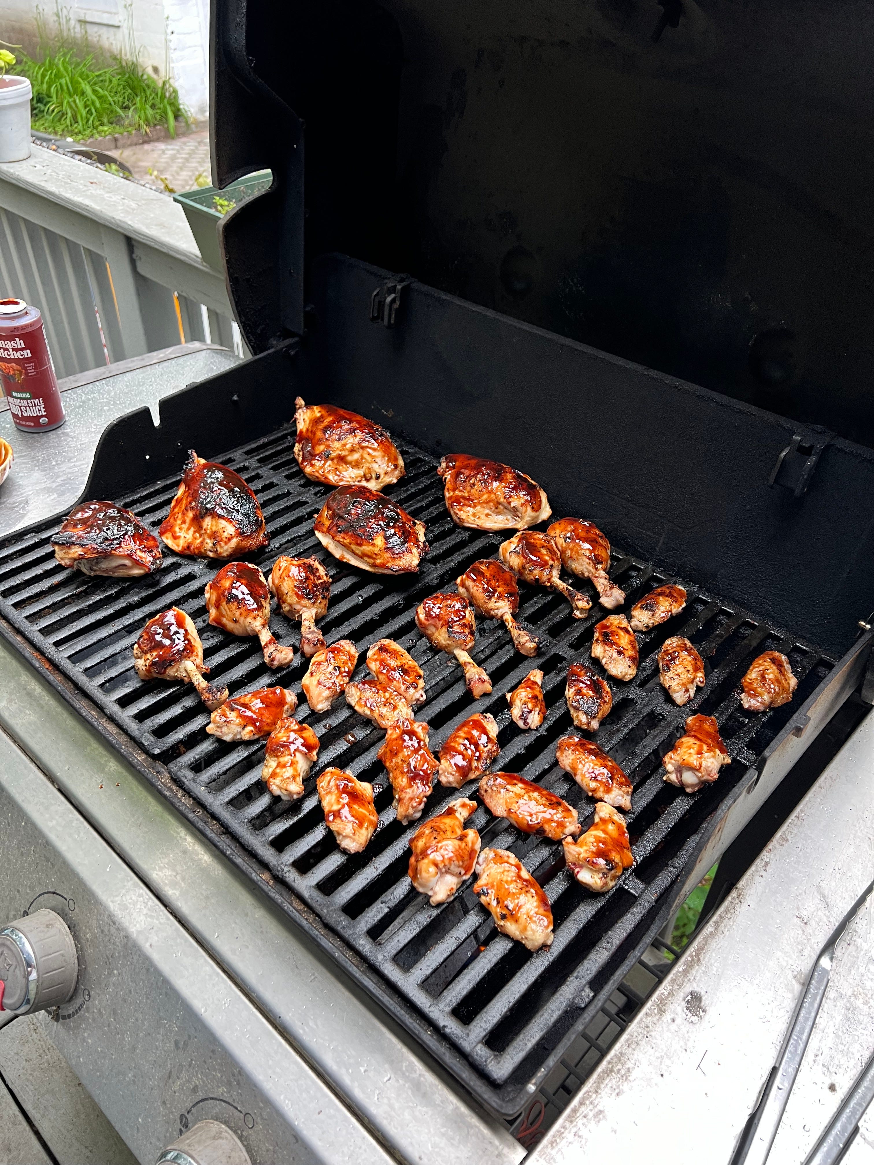 Grill for another 5–10 minutes, brushing with more sauce and turning once or twice, until nicely caramelized and internal temperature reaches 165°F for thighs and legs, 160°F for breasts.