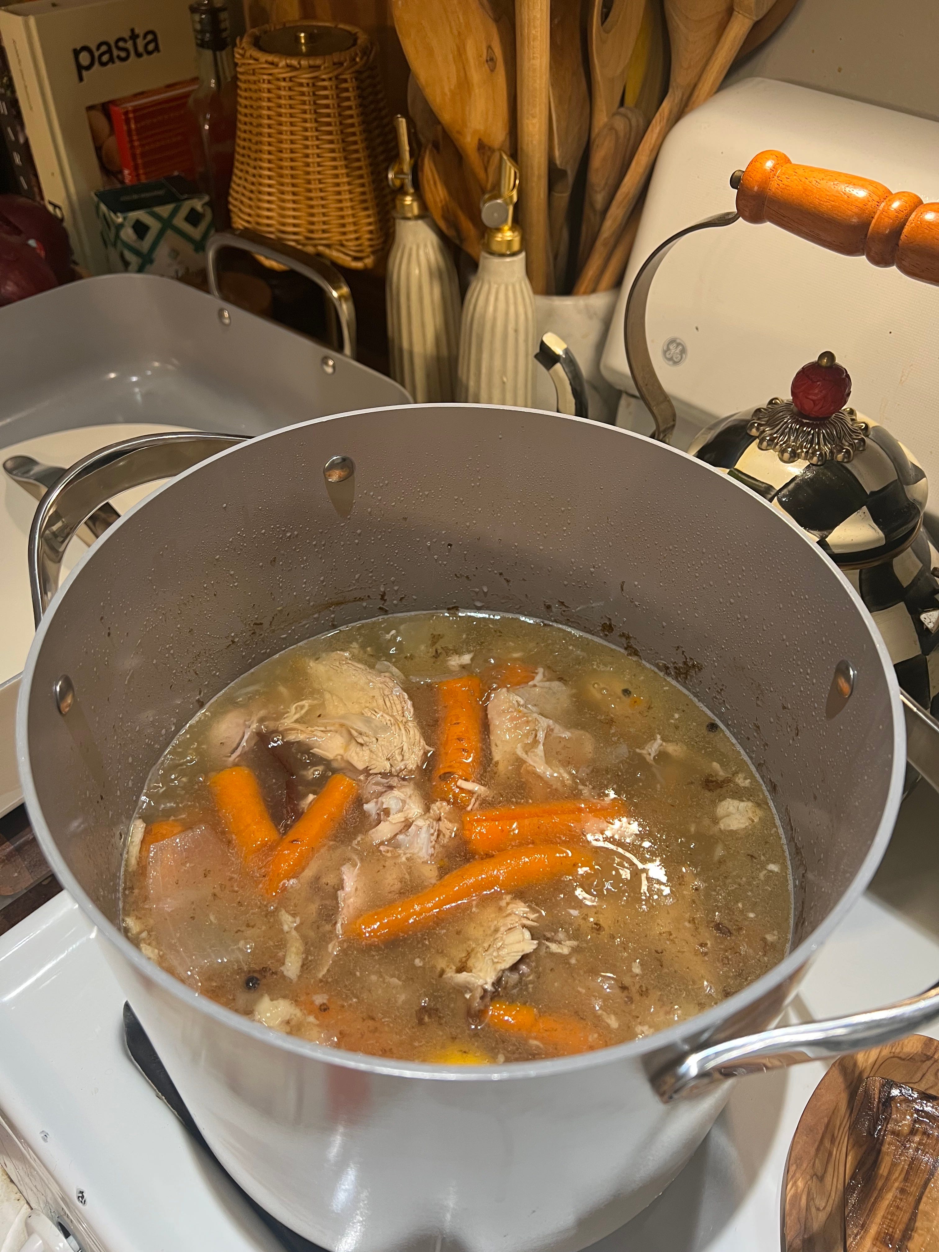 I love roasting chicken in the fall and winter, and whenever I do, I make homemade stock with the bones. After roasting, I throw the carcass, all the bones, some veggies, and water into a big pot and let it simmer for as long as I can.