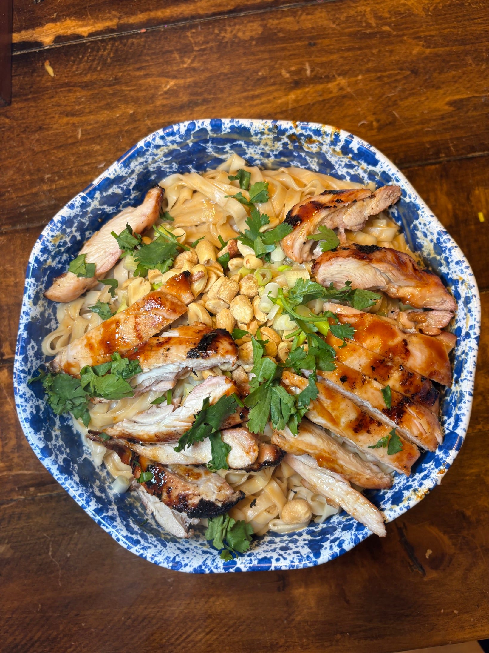 Divide the noodles into bowls. Top with the sliced grilled chicken, chopped