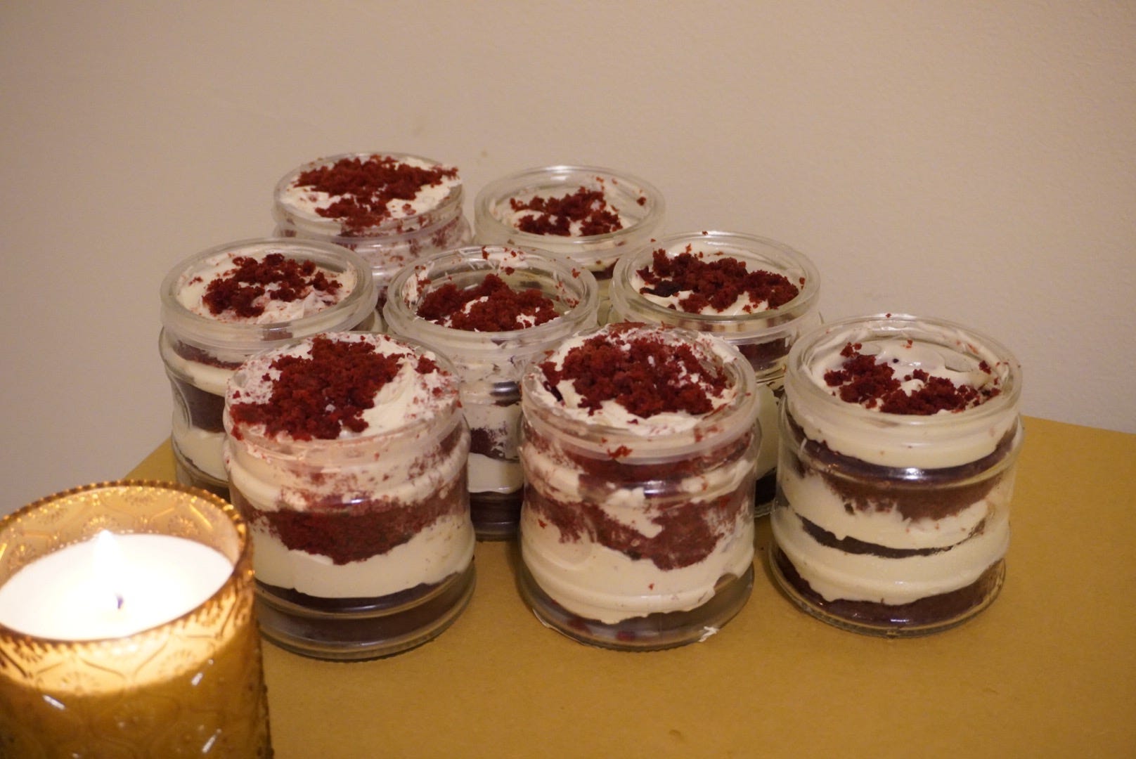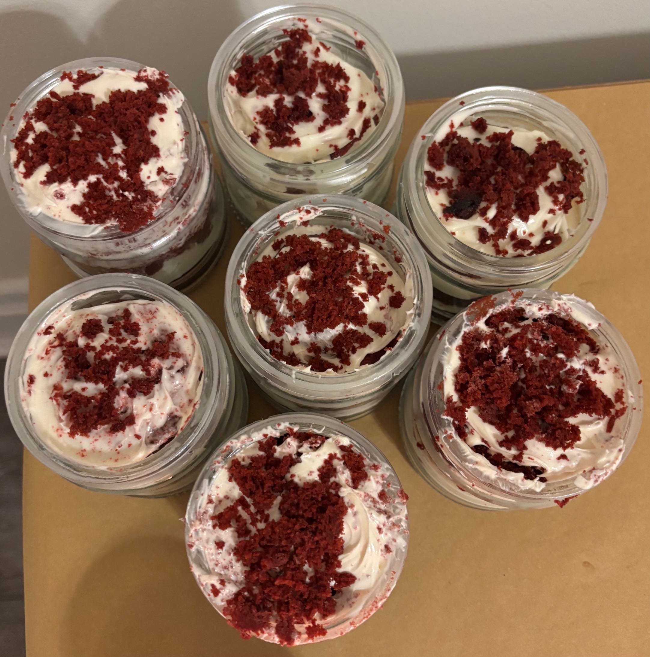 I went with cupcakes in a jar because I have been obsessed with baking cakes lately. I always watch cake decorating videos on TikTok so I’ve been really into them! I made red velvet cupcakes and cream cheese icing! I just baked the cupcakes and after letting them sit cut them up and started layering my jars! The last layer I did was frosting and I sprinkled some of the leftover cupcakes on top to make them look cuter! I was really excited with how they turned out!