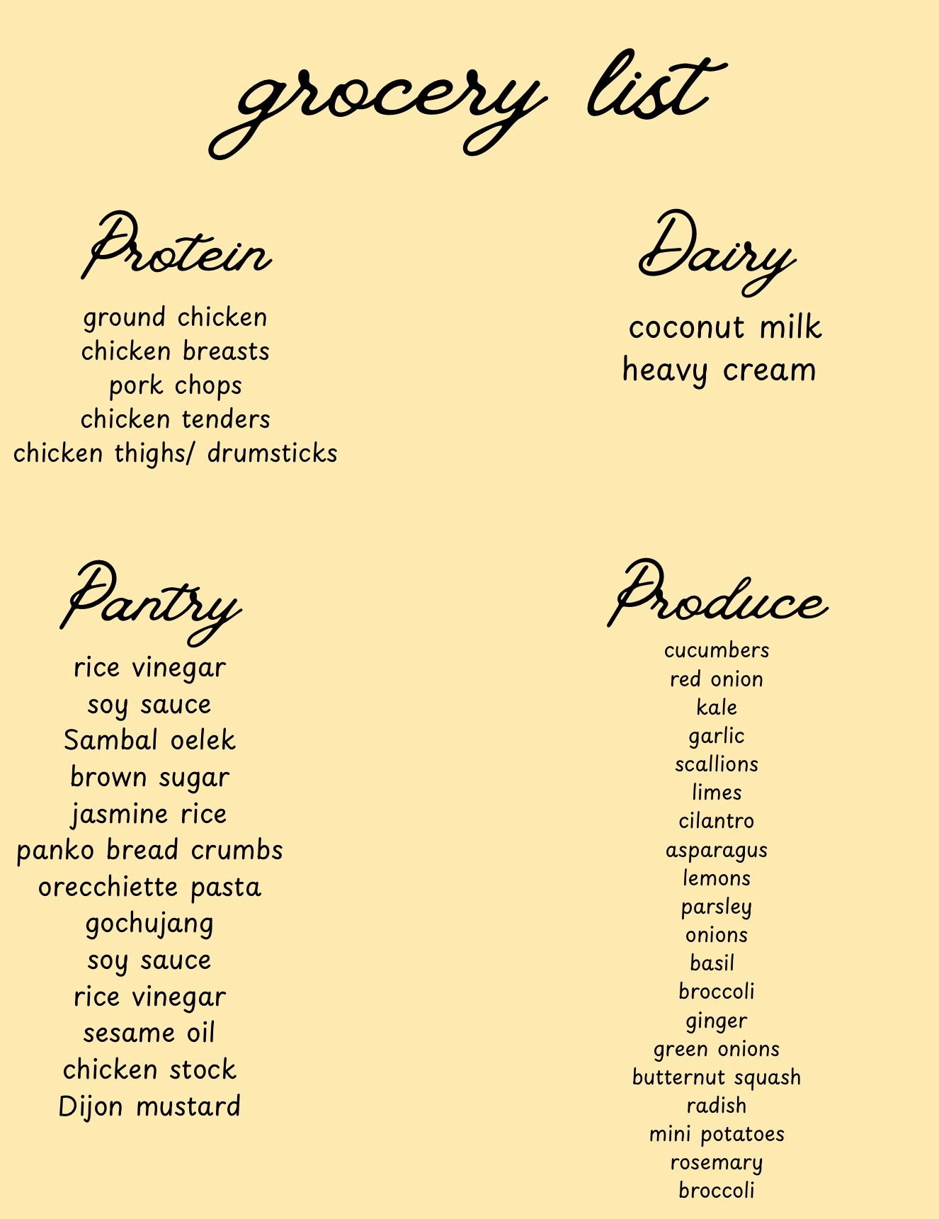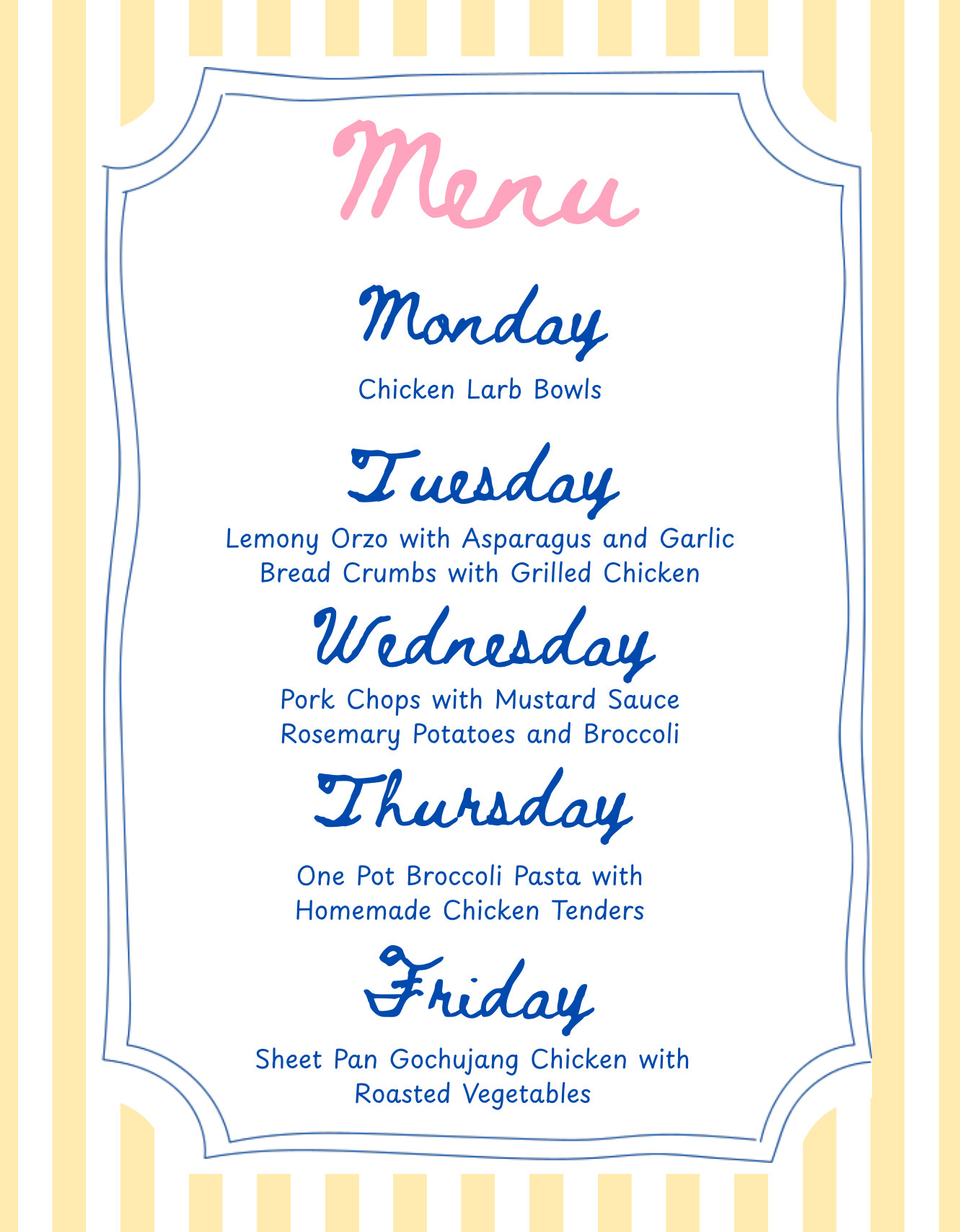 Hi everyone! Welcome back to week 4 of weekly meal plan. This week’s menu is all about simple dinners with minimal ingredients. Mondays dinner is Larb Bowls and they are such a staple here. Easy to prepare and the kids love it. I love any recipe from the NYTcooking app. They are always delicious and easy and only a few ingredients. I put a few NYT recipes for this weeks and also a few from Jessica Seinfeld. She does a lot of easy recipes with fresh ingredients. As always, leave any suggestions or questions in the comments. Hope everyone has a great weekend!