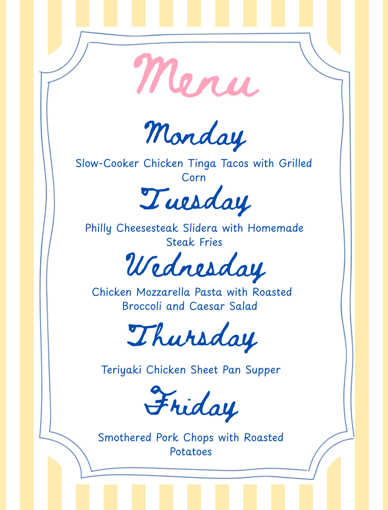 Weekly Menu7kidskitchenMay 24, 2025184Sharehere’s everything you need to make these five dinners this week! Welcome back to week 6 of the weekly menu!Links: MondayTuesdayWednesdayThursdayFridayTalk soon, Mary